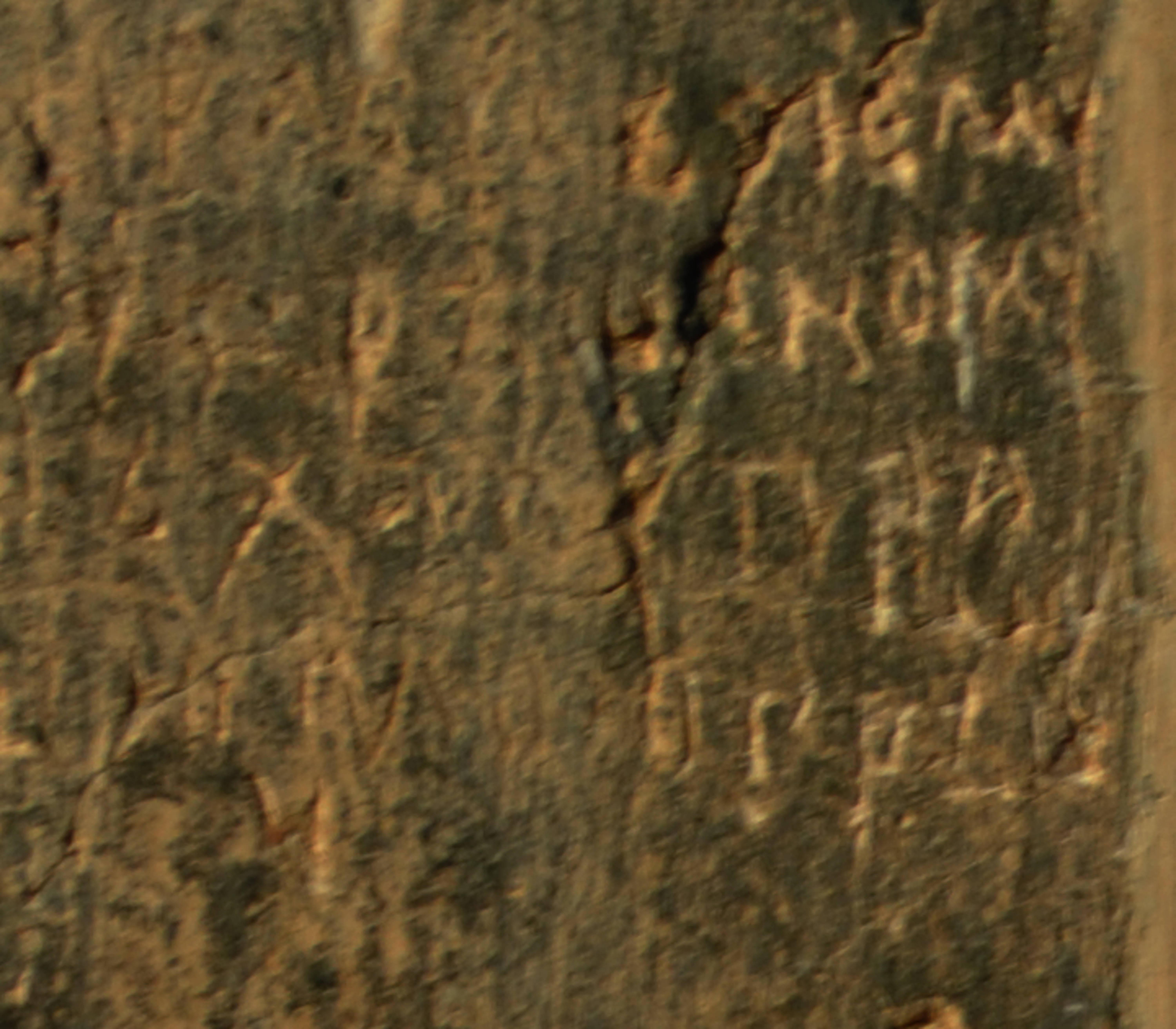 | Расположение на носителе | Южная сторона юго-восточного столба. На фресковом фоне, справа от фигуры мученицы (Н. В. Пивоварова определяет эту фигуру как изображение святой Февронии или Матроны [Пивоварова 2002: 241, 213]), слева от надписи о смерти Кирила и «жены его Оксении». Высота от пола 159,5 см, расстояние от правого края 18 см, длина граффити 9,5 см, высота букв 3 см. (Рождественская 2016б) |