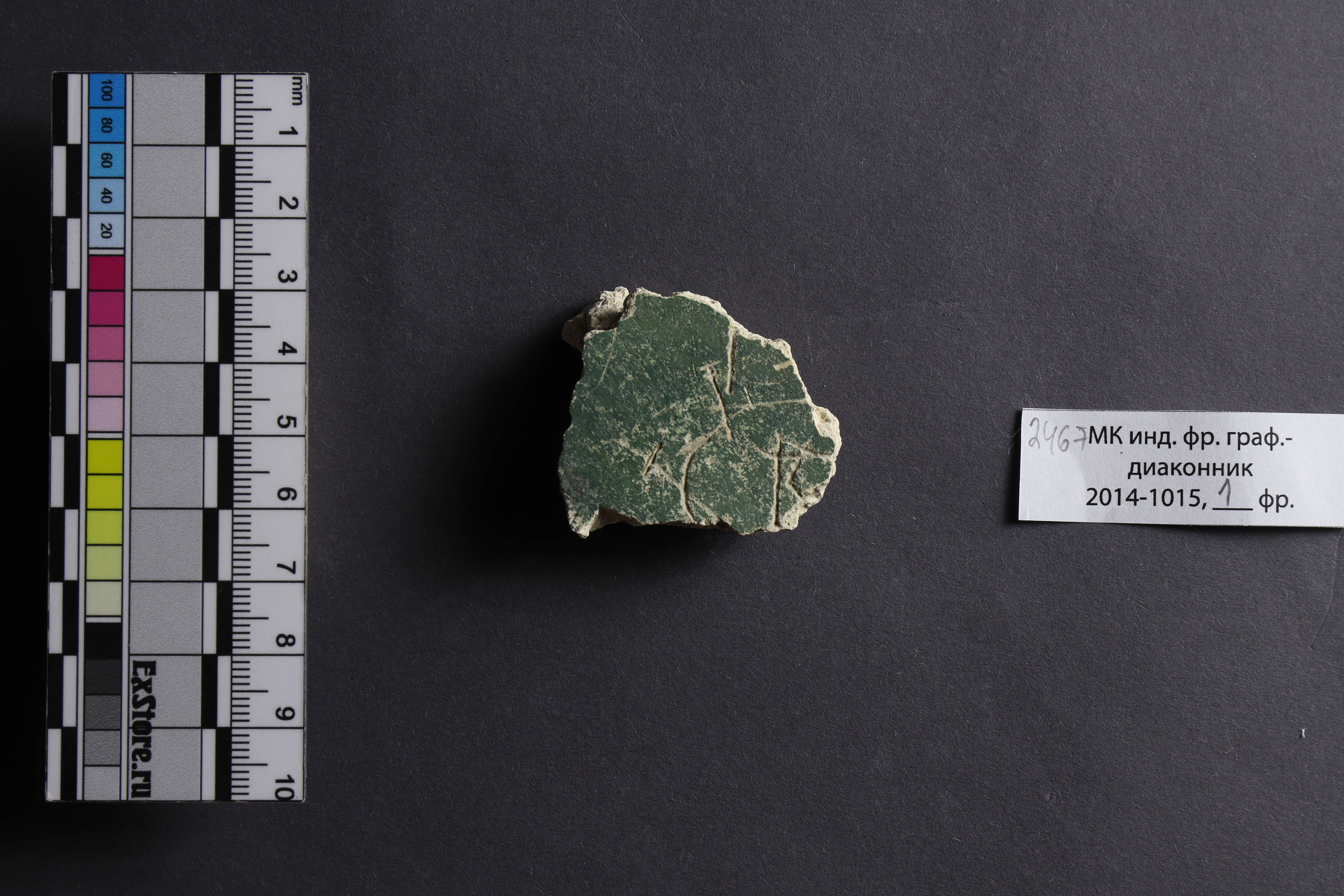 | Расположение на носителе | Фрагмент 2467 был найден в южной апсиде Георгиевского собора. «Фрагмент зеленого фона, с затертостями». (Гиппиус, Щеголькова 2024) |