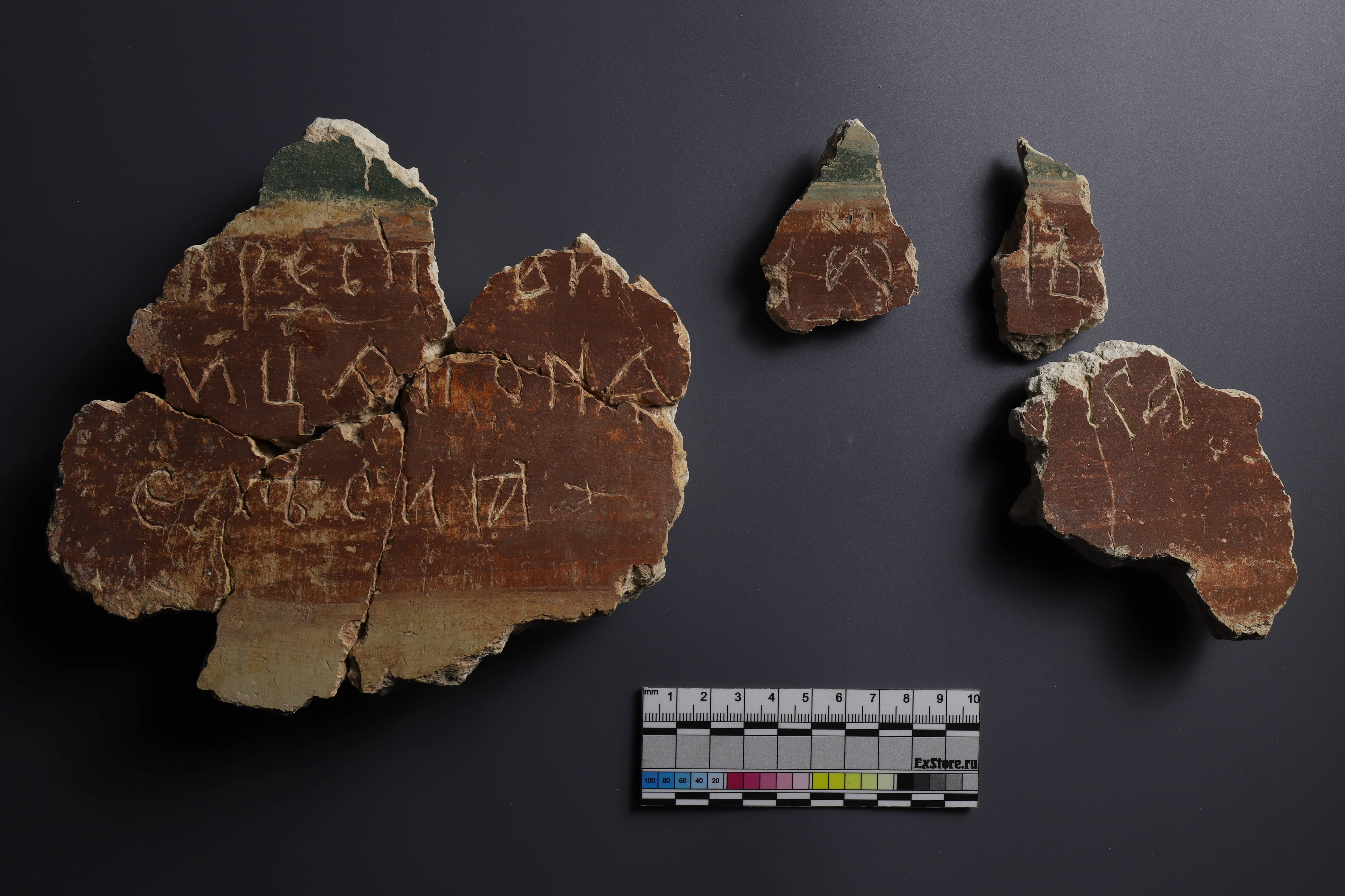 | Расположение на носителе | Фрагменты 2500*/2962, 2501, 2502, 2561 были найдены в северной апсиде. «Блок из трех кусков штукатурки – монолита и двух отдельных фрагментов в три цвета. Надпись читается посередине, под линией разгранки, разделяющей зеленый и красный фоны; ниже них лежит бежевый, переходящий в белый. К нижнему краю появляется больше затертостей/повреждений красочного слоя (преимущественно, красного с проступающим бежевым)». (Гиппиус, Щеголькова 2024) |