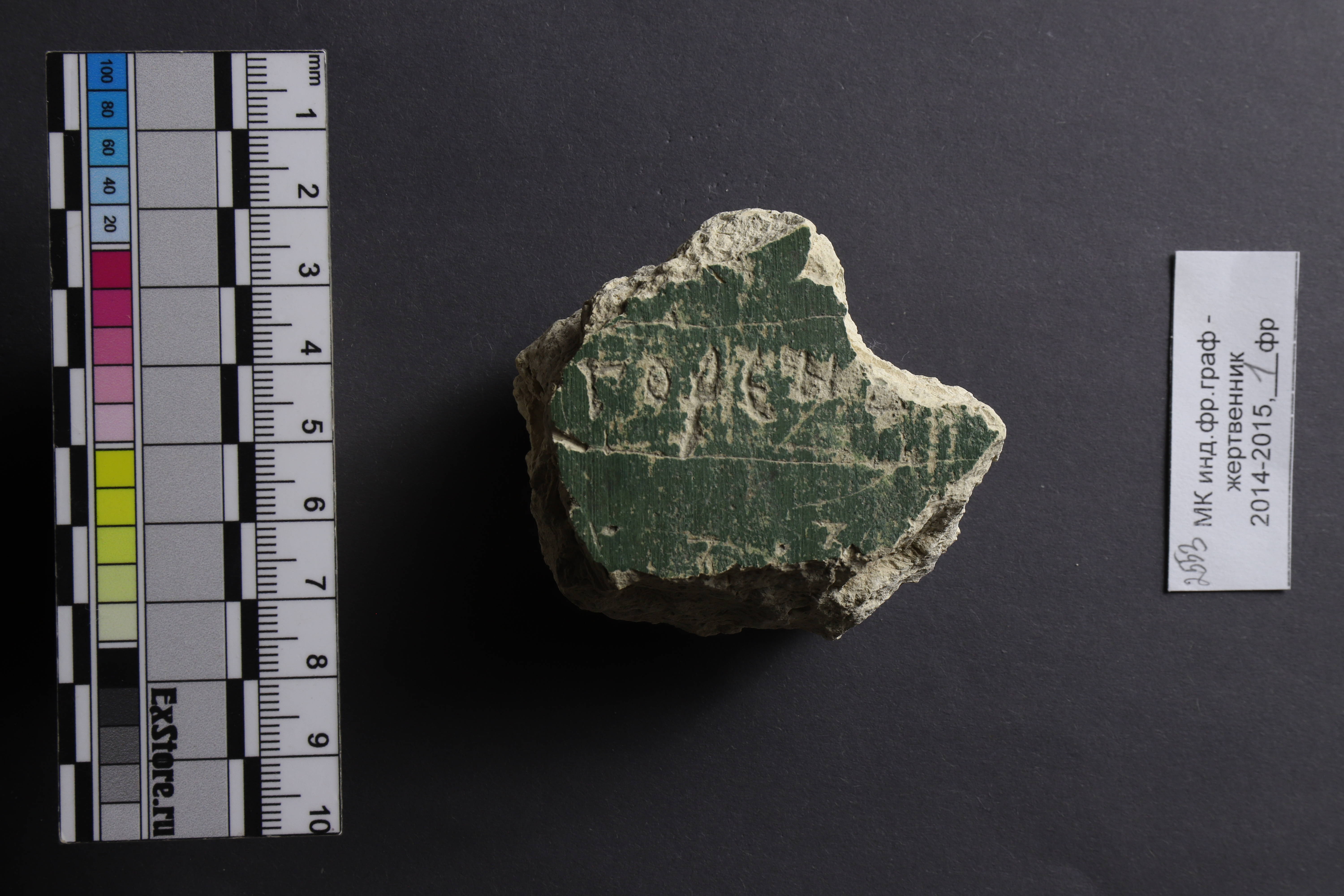 | Расположение на носителе | Фрагмент 2553 был найден в северной апсиде. «Фрагмент зеленого цвета. Среднюю часть занимает однострочная надпись в скругленной слева рамке». (Гиппиус, Щеголькова 2024) |