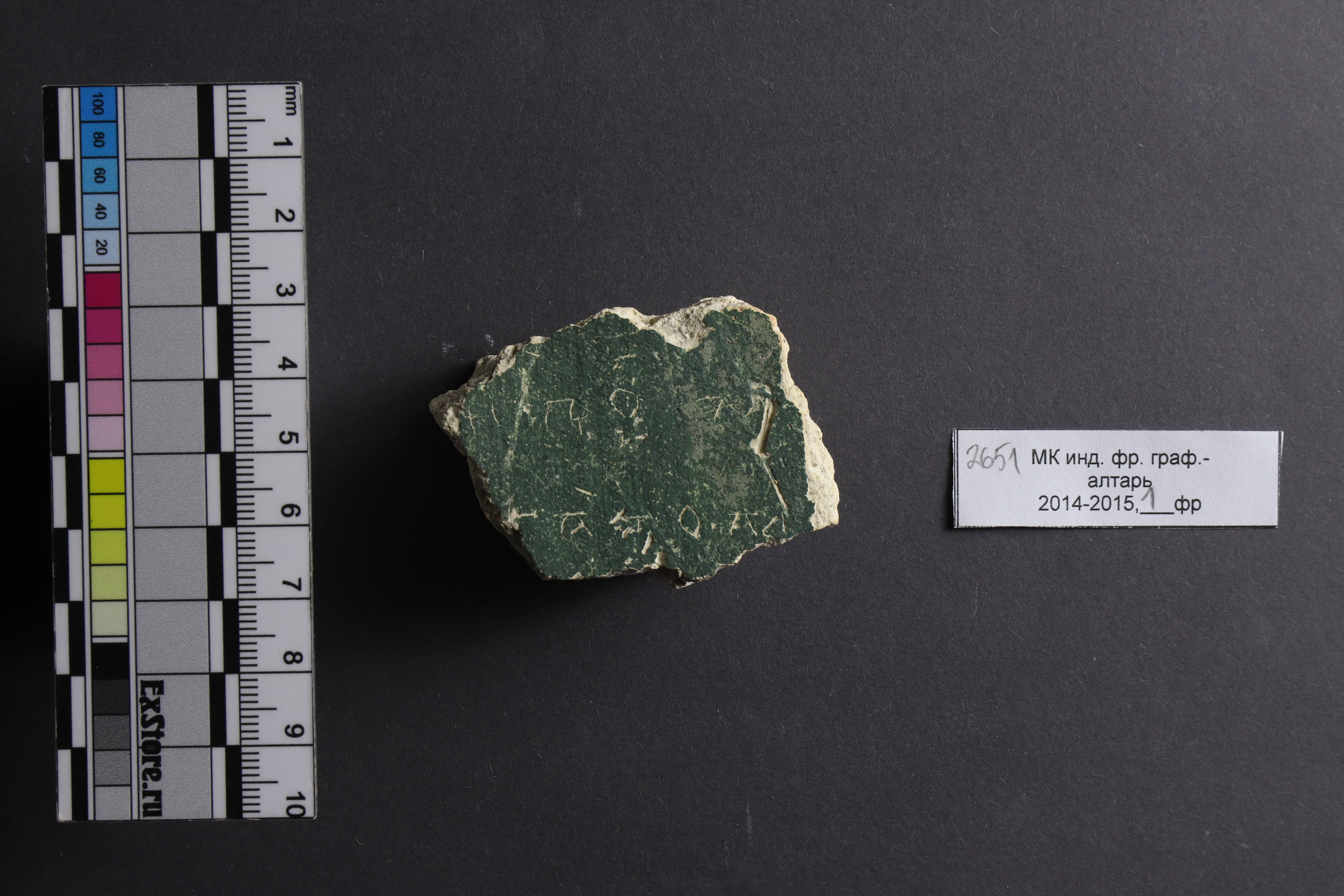 | Расположение на носителе | Надпись расположена на фрагмента 2651, найденном в центральной апсиде. «Фрагмент зеленого цвета с мелкими точечными выпадениями краски и наложением пигмента (?) другого оттенка. Видно несколько выпавших соломинок и царапину. Направление кисти почти не просматривается, оно, скорее, диагональное». (Гиппиус, Щеголькова 2024) |