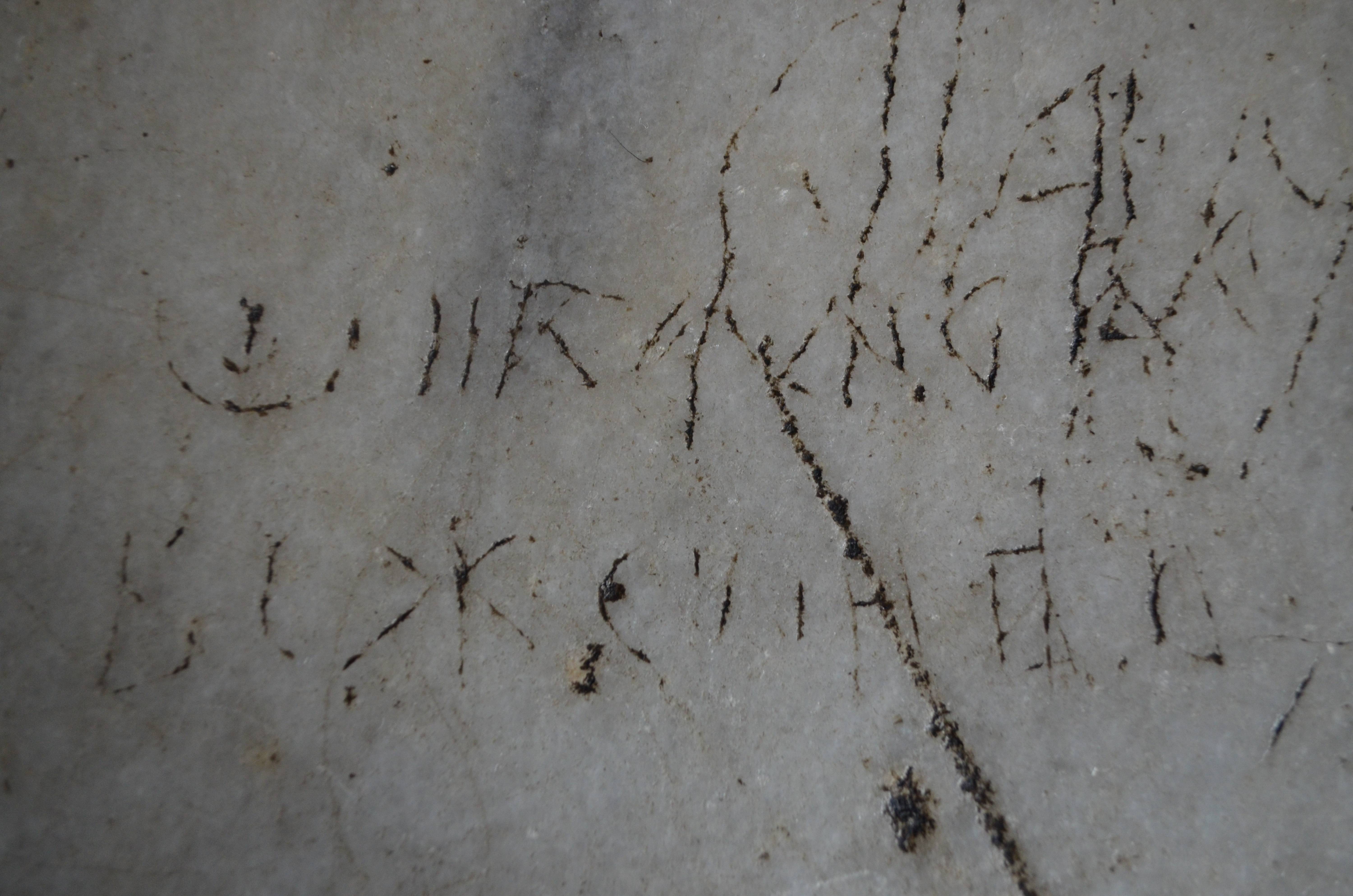 | Расположение на носителе | Западная часть южной галереи. Надпись выполнена на третьих слева перилах ограждения экседры. Расстояние от колонны слева – 186,5 см, от колонны справа – 33 см. Граффито состоит из двух строк: длина первой – 11 см, второй – 10,8 см; обе выполнены с наклоном вверх. Высота букв колеблется от 0,7 см (н в Иваново) до 1,8 см (у в рабу), интервалы между ними приблизительно равные. Несмотря на многочисленные царапины и штрихи иных начерков, надпись уверенно читается благодаря образовавшемуся со временем темно-коричневому «загару». (Артамонов, Гиппиус 2023) |