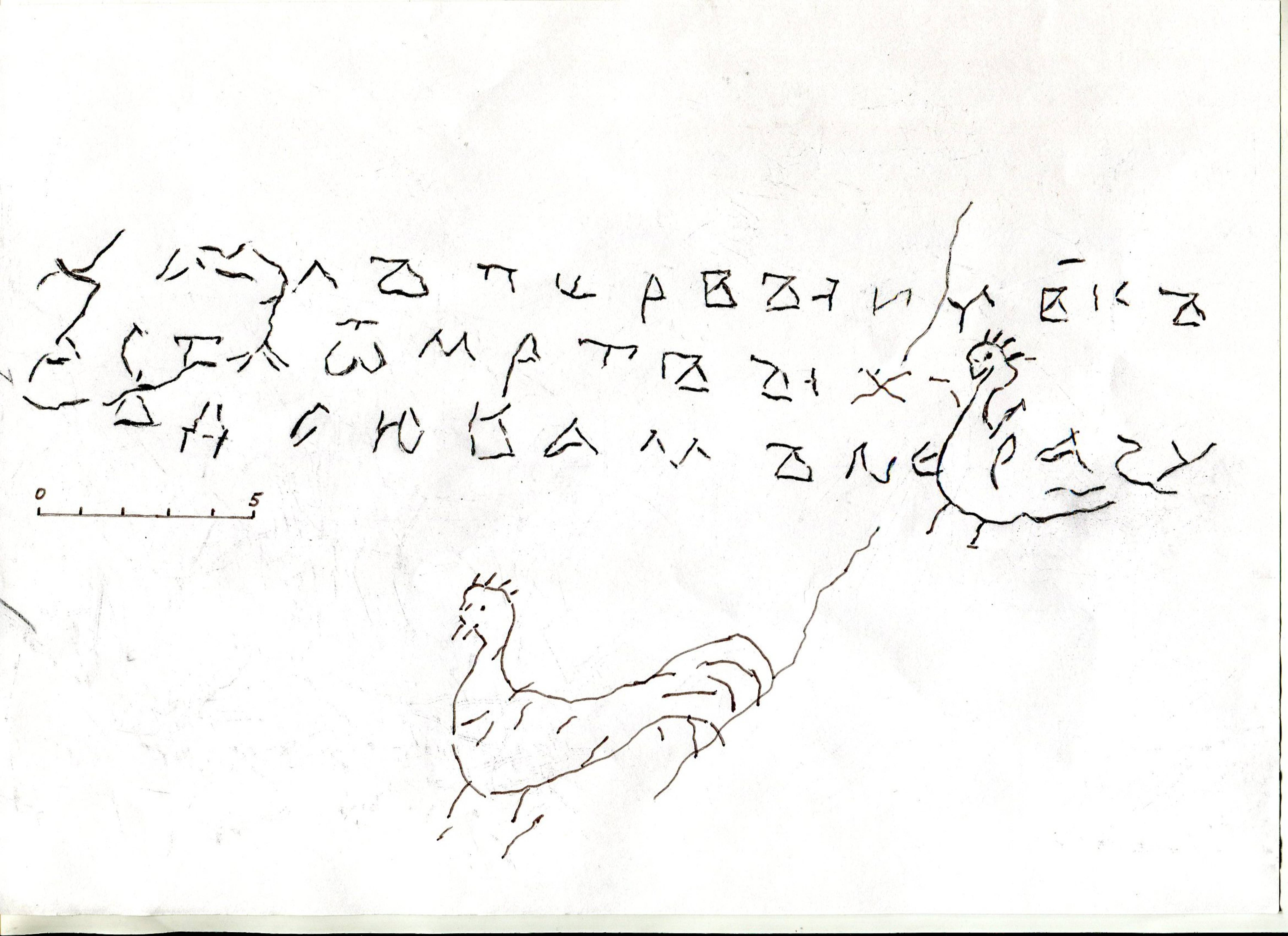 | Расположение на носителе | Северная стена. На поверхности северной стены, в ее западной части, на уровне северо-западного столба, выше человеческого роста. Около 160 см от пола, длина 20,5 см, ширина 4,5 см, высота букв 1 см. Сохранилась не полностью; начала строк закрыты реставраторской вычинкой, процарапана очень тонкой иглой в три строки, справа перекрыта рисунком птицы с хохолком на голове в виде четырех черточек и с отростком под клювом, напоминающим петушиный гребень, ниже похожий рисунок еще одной птицы с хохолком и пышным хвостом. (Рождественская 2016б) |