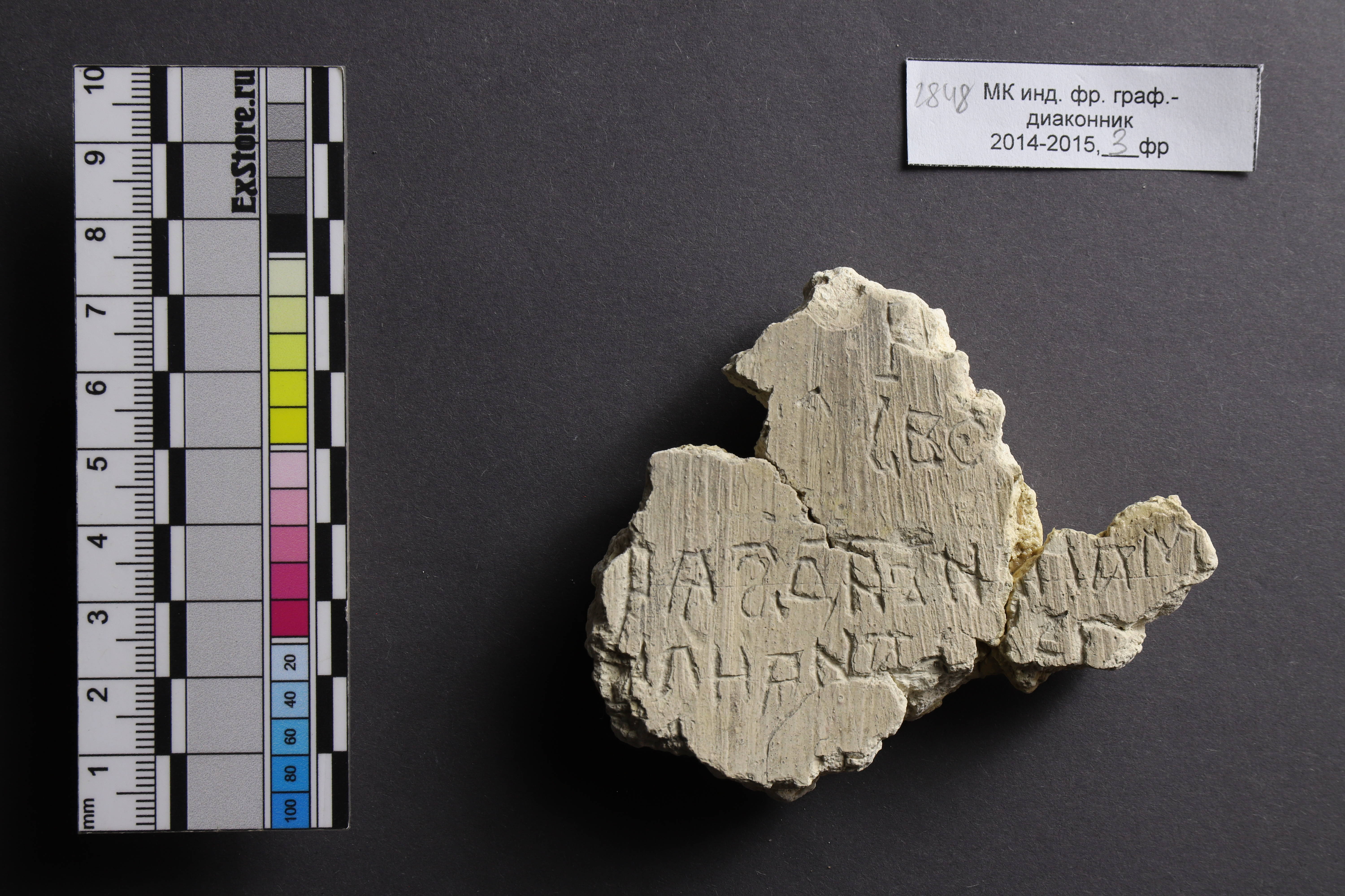| Расположение на носителе | Фрагмент 2848* найден в южной апсиде Георгиевского собора Юрьева монастыря. «Блок из трех кусков штукатурки светлобежевого (светлосерого) цвета. Направление кисти ярко выраженное, вертикальное, очень заметное. В нижней части поверхность сглаживается, становится почти ровной». (Гиппиус, Щеголькова 2024) |