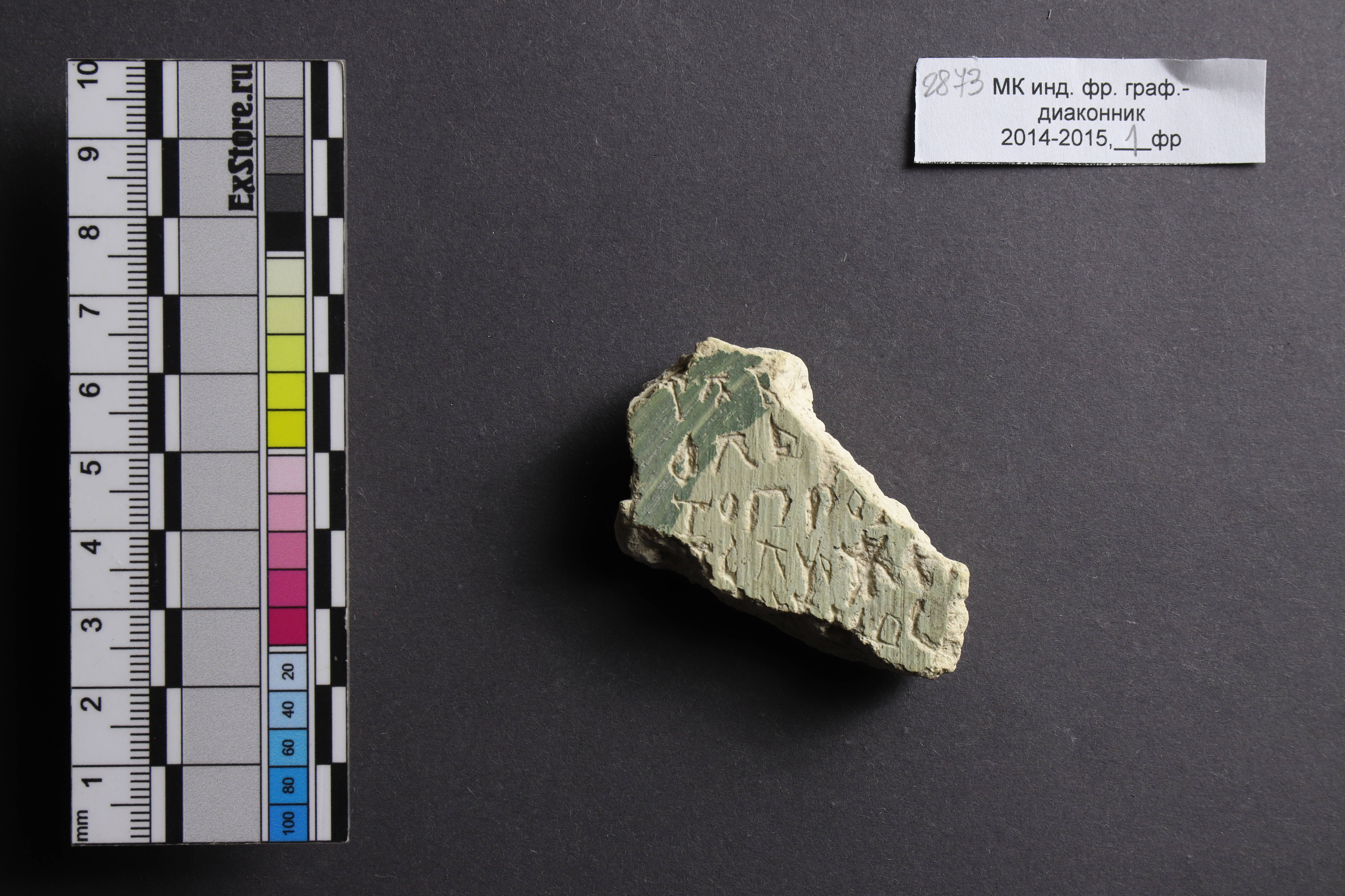 Фрагмент 2873 обнаружен в южной апсиде. «Фрагмент салатового цвета с зеленой полосой, изгибающейся дугой в верхнем левом углу. Направление кисти: на салатовом фоне – ярко выраженное, как бы ребристое, вертикальное; на зеленом фоне – по линии изгиба. Надпись читается по всему полю фрагмента. Значительных повреждений красочного слоя нет. Скорее всего, надпись читалась на мраморировке».