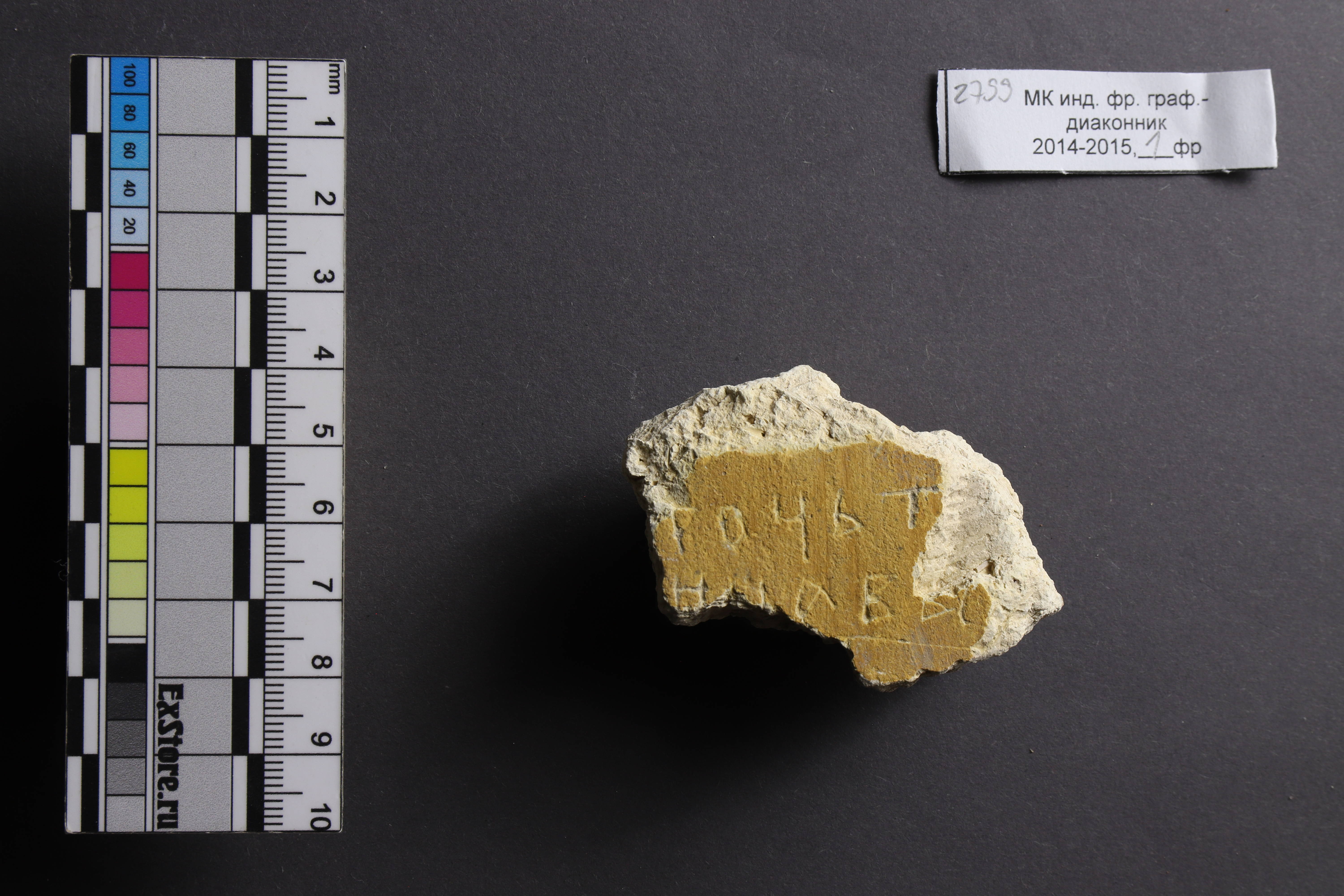 | Расположение на носителе | Фрагмент 2799 обнаружен в южной апсиде. «Фрагмент охрового цвета. Поверхность шершавая, направление кисти вертикальное». (Гиппиус, Щеголькова 2024) |